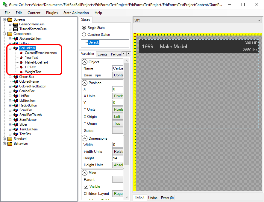 Above we covered how to use data binding to update the visuals on a ListBoxItem. Another option is to create a derived ListBoxItem and handling the visuals manually. This approach is useful if you are not comfortable with using binding. For this example consider a racing game with a list of cars. We can create a CarListItem in Gum to display information about cars in a player's garage.