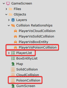 * The GameScreen contains a CollisionRelationship between the PlayerList and PoisonCollision