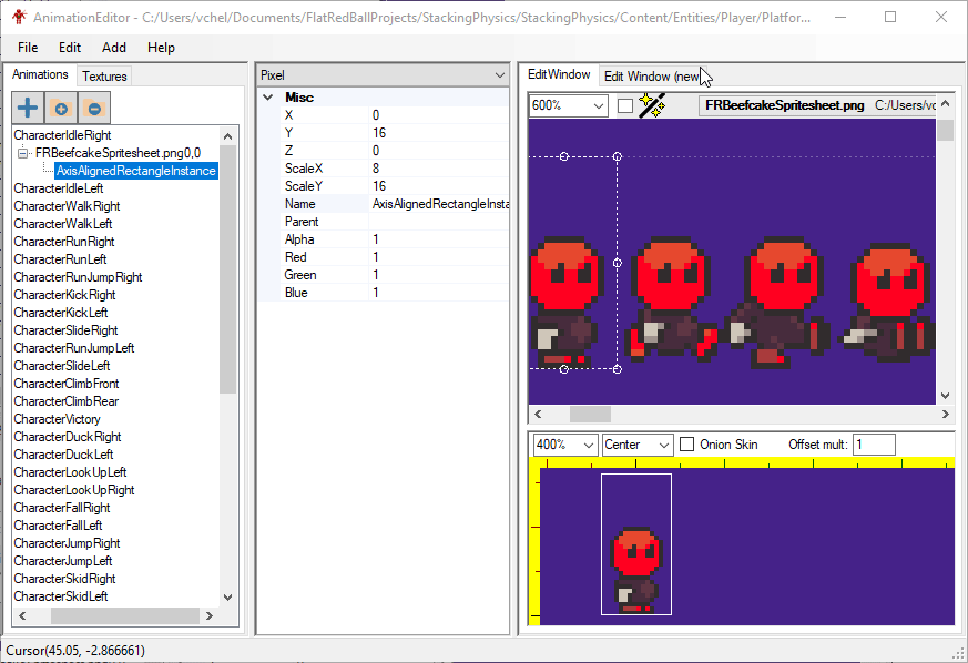Changes to shapes will automatically be saved to disk. The example above shows an animation with a single frame, but since each frame can contain rectangles, then this allows the collision size to change frame-by-frame.