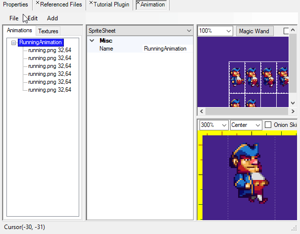 Each frame in an animation defines how long it is displayed when the animation is played. The animation editor allows editing the frame time to speed up or slow down individual frames or the entire animation.