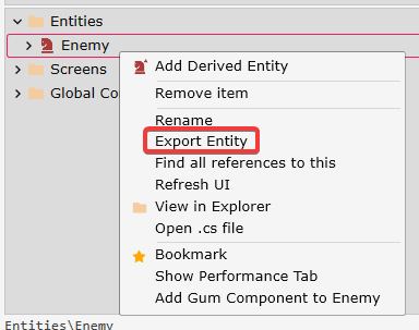 Screens and Entities can be exported through the FlatRedBall Editor to be imported later. For importing, see the [Importing Entity page](https://docs.flatredball.com/flatredball/glue-reference/entities/glue-reference-import-entity).