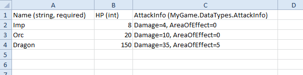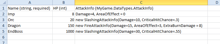 Many games require data types which are more complex than can be identified with simple primitives. For example, you may be creating a game which needs enemy types defined. Each row in your CSV may represent an enemy type; however each instance may also need a non-primitive type to define the type of attack damage it does. If these classes were laid out in code, they might look like this:
