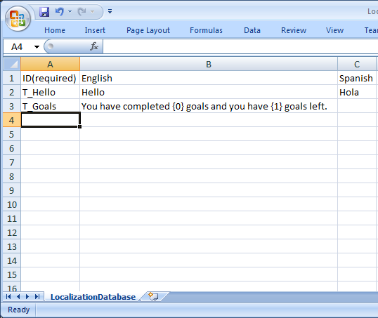 First we'll create a spreadsheet file that will serve as a localization database. To do this: