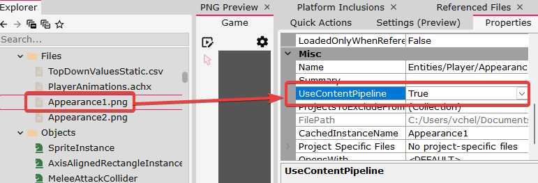 The UseContentPipeline property on files controls whether a file is loaded using the *content pipeline*. The content pipeline is a tool provided by MonoGame and Kni which converts raw files (such as .wav and .png) to processed files with the .xnb extension. By default most files do not use the content pipeline - they load *from-file*.