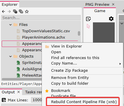 FlatRedBall automatically builds files as necessary, such as when the FRB editor is opened or if the source file changes on disk. However, files can be re-built by right-clicking on the file and selecting **Rebuild Content Pipeline File (xnb)**.