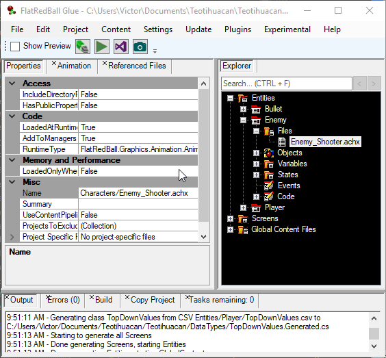 A file's name represents its qualified location relative to the project's Content folder. By default, newly-created files will be added to a folder specific to the container Screen, Entity, or Gloabl Content Files. However, a file can exist outside of the default folder, so long as it is in the project's Content folder. For example, the following file is located in the Enemy entity, but its location on disk is **\<Project Content Folder>/Characters/Enemy\_Shooter.achx**: