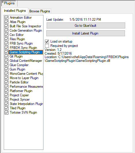 Plugins are loaded by Glue through a .dll. When a plugin is selected, the Plugins tab will display the location of the selected plugin.