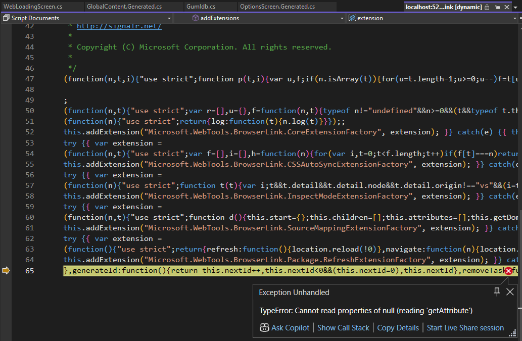 If you do encounter this problem, you can press F5 or continue execution and the game will run normally. This exception will not cause any problems for deployed games.