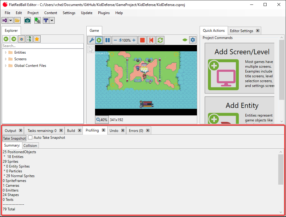 The Profiling tab provides high-level information about your game related to runtime performance. This can be used to determine what kind of optimizations may have an impact on your game's FPS.