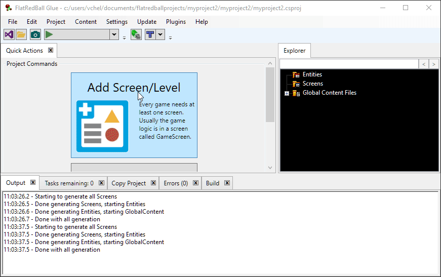 Many games include a Gum screen for every FRB screen. Gum screens can be used for UI such as buttons and textboxes (usually using FlatRedBall.Forms) or can be used for read-only UI such as score and health display. Screens can be added in a variety of ways, depending on the state of your project.