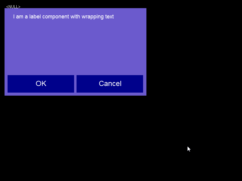 The label component is only a container with a single Text object. Functionally we could skip creating a Label component and add a Text object directly to the Popup component. We will be creating a Label component to show how to include some components in events (Buttons) and exclude others (Label). When finished your Label should look similar to the following image: