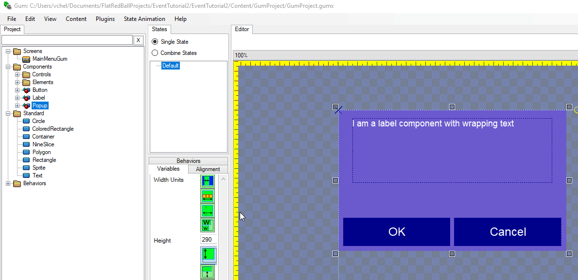 This tutorial continues our look at working with events on Gum objects. The previous tutorial covered the most basic situation - a clickable button in a screen. We'll expand upon the previous tutorial by creating a more complicated example - handling events on a popup container which displays a message and allows the user to click **OK** or **Cancel**. This tutorial covers the second property for controlling events: **ExposeChildrenEvents**.