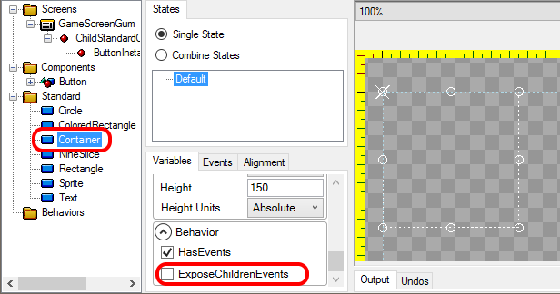**HasEvents** and **ExposeChildrenEvents** decide whether a component and its children are recognized as UI objects by the FlatRedBall engine. More specifically, they decide whether instances of these components are added to the GuiManager's windows list, and whether the GuiManager.Cursor can interact with these instances. Since each value can be independently set, then there are four possible combinations of values.
