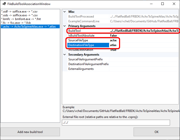 To use the AchxToSpineAtlas.exe tool as a File Build Tool in FlatRedBall:
