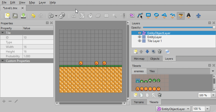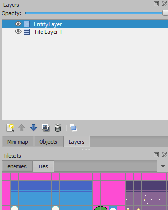 Once you have imported the file, Tiled will let you apply this type to tiles in your tileset and objects in your object layers. To create entity instances using tiles: