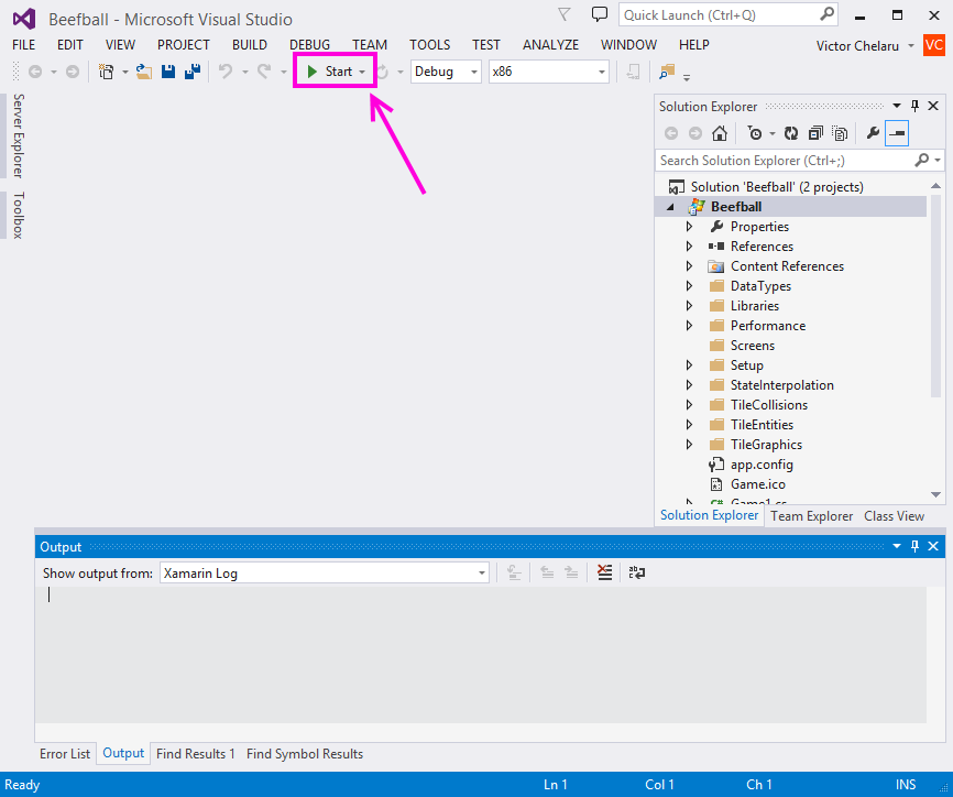 If so you should select the version of Visual Studio that is compatible with the type of project you are running. At the time of this writing, Visual Studio 2022 Community is the most common version to use with FlatRedBall. Once Visual Studio is open, you can run your project by pressing the "start" button, or by pressing F5.