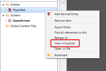 For example, the PlayerBall entity creates PlayerBall.glej, PlayerBall.cs, and PlayerBall.Generated.cs. These files can be viewed by right-clicking on the entity and selecting **View in Explorer**.