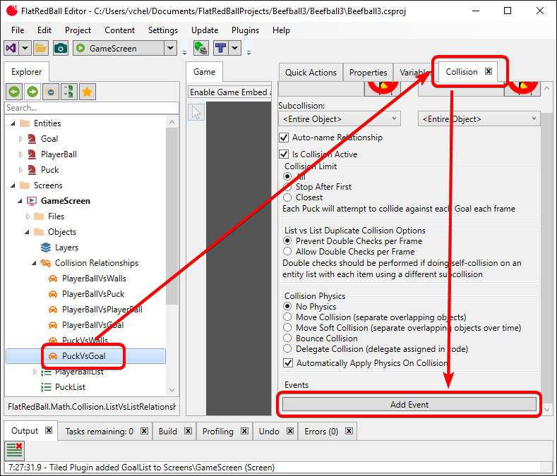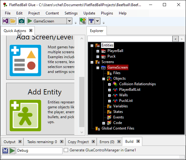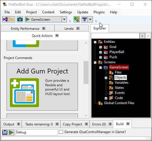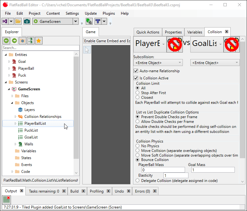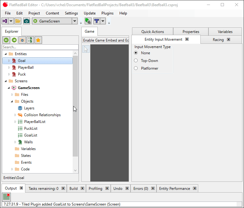 Next we'll add two goal rectangles to the GameScreen. Instead of using the Quick Actions tab, we'll show an alternative method here by drag+dropping the Goal entity onto GameScreen. Do this twice, changing the name of the first to LeftGoal and the second to RightGoal: