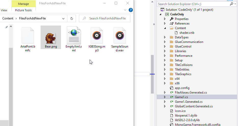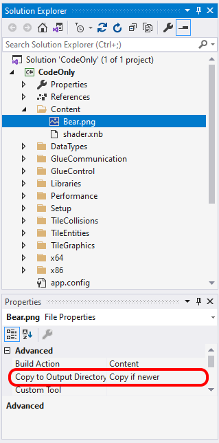 This tells Visual Studio to copy the Bear.png file to the output directory (where the .exe is created) while maintaining the folder structure. For example, if your .exe is built to \<Project Root>\bin\DesktopGL\x86\Debug\CodeOnly.exe, then the Bear.png file will be copied to \<Project Root>\bin\DesktopGL\x86\Debug\Content\Bear.png.