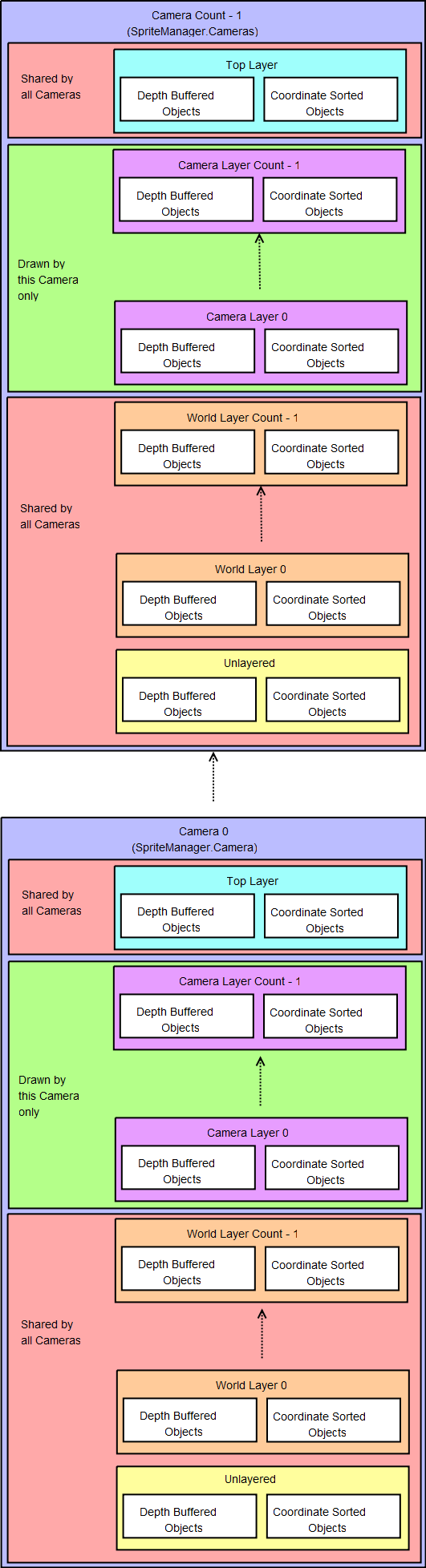 This diagram can best be read bottom-up. The very bottom section (Camera 0, Unlayered) is where objects are added by default when added through managers like the [SpriteManager](https://github.com/flatredball/FlatRedBallDocs/blob/main/frb/docs/index.php) or [TextManager](https://github.com/flatredball/FlatRedBallDocs/blob/main/frb/docs/index.php). [Layers](https://github.com/flatredball/FlatRedBallDocs/blob/main/frb/docs/index.php) added to the [SpriteManager](https://github.com/flatredball/FlatRedBallDocs/blob/main/frb/docs/index.php) are added as world [Layers](https://github.com/flatredball/FlatRedBallDocs/blob/main/frb/docs/index.php). [Layers](https://github.com/flatredball/FlatRedBallDocs/blob/main/frb/docs/index.php) [added to Cameras](https://github.com/flatredball/FlatRedBallDocs/blob/main/frb/docs/index.php) are specific to the [Camera](https://github.com/flatredball/FlatRedBallDocs/blob/main/frb/docs/index.php) they are added to. To move objects to specific [Layers](https://github.com/flatredball/FlatRedBallDocs/blob/main/frb/docs/index.php), call AddToLayer on the appropriate manager for the objectt to be moved.