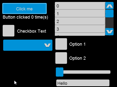 Once one of the controls on a screen has focus, the gamepad can interact with it. For example, the following images and animations show interaction which can be performed with a gamepad including clicking a button, selecting items in a list box, and moving the slider. Once the ButtonInstance IsFocused is set to true, the button appears focused with a white rectangle.