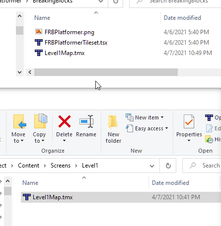 Our game already contains a file named Level1Map.tmx - this is the default name of the TMX added to our Level1 Screen. We can replace this file on disk with the downloaded file. We need to remember to also copy over the other two files. To do this: