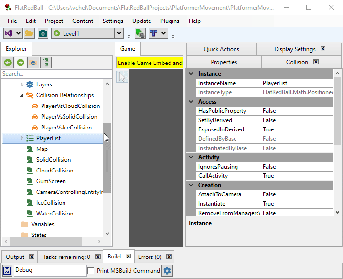 As shown in the previous tutorial, the Player already collides with the solid collision. This is automatically added by the New Project Wizard, so we don't have to do any setup for ground collision. We'll add ice collision first. To do this: