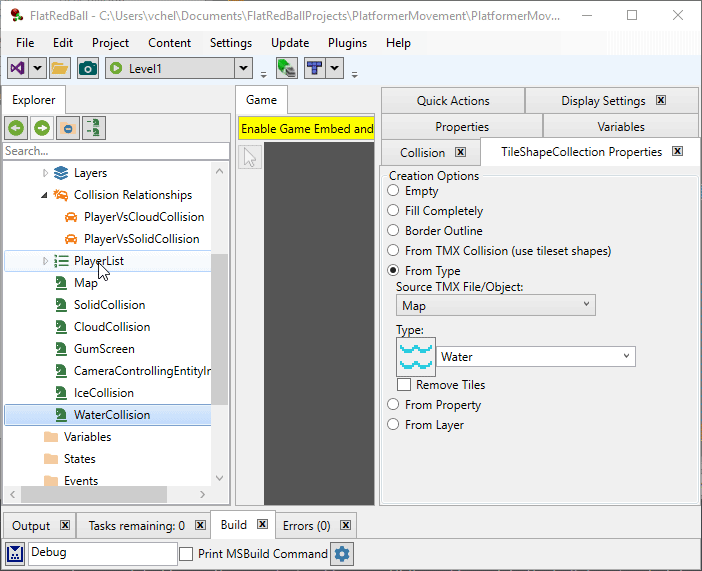 Now our game has ice and water TileShapeCollections and collision relationships. You may have noticed that the ice currently acts identical to solid collision (bricks). The next tutorial will create new platformer variables for moving on ice and swimming in water, and will switch between them in response to collision.