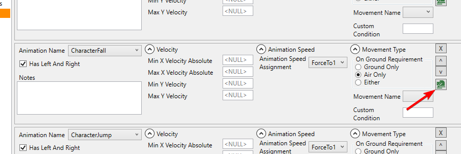 The player will now play the CharacterWallSlide animations if the IsSlidingOnWall property is set to true. Note that the .achx file contains CharacterWallSlideLeft and CharacterWallSlideRight, but the generated code selects the appropriate one based on which way the player is facing.