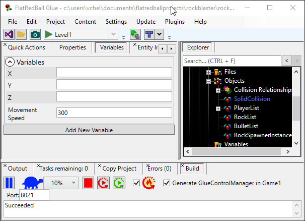 So far we've created a few collision relationships. This tells the game that we want something to happen when objects collide, but we haven't yet told Glue what we want to happen. First we'll start with the RockListVsRockList collision relationship. To edit a collision relationship, click it and select the Collision tab. Notice that there are lots of options available to customize collision relationships.