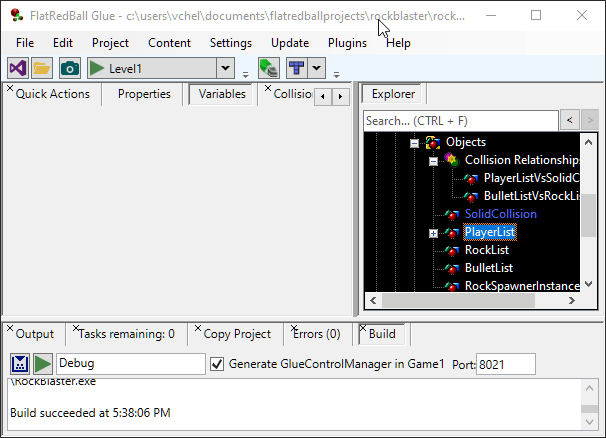 To create a collision relationship, drag+drop one list in the GameScreen onto another list. For example, dragging the BulletList on top of the RockList will create a collision relationship between these two lists.