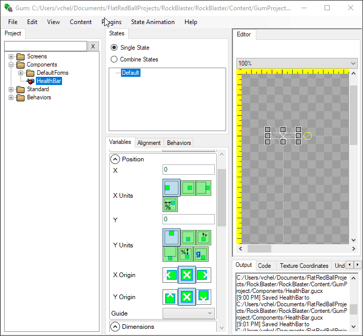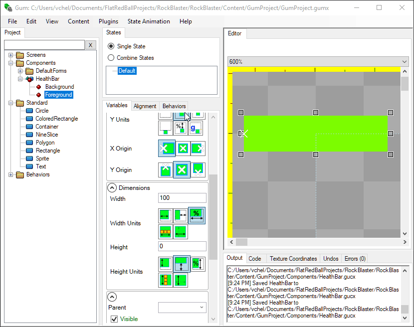 Previously we added a score Text object in Gum. This Text object existed in *screen space* - it was positioned relative to the top-left corner of our screen. Health bars will be different - they will be positioned relative to the Player instance. To create a HealthBar Component in Gum: