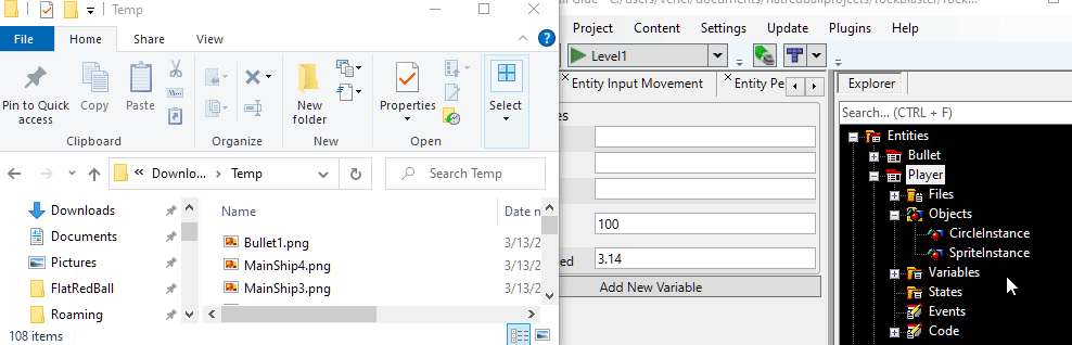 Next we will add a file and Sprite to the Bullet entity. This process is essentially the same as when we added PNG files and a Sprite to our Player Entity so you may find these steps familiar. To add the PNG: