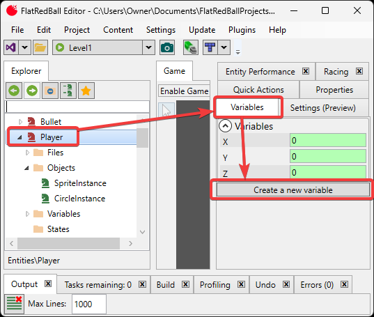 For this game, the Player will continuously move forward at a constant speed. The Player object will be turned left and right with the keyboard or Xbox gamepad. Before we begin writing any code we'll add two variables to Player: **MovementSpeed** and **TurningSpeed**. To do this: