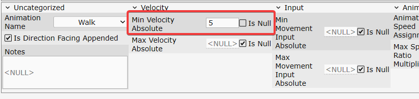 <figure><img src="https://951240982-files.gitbook.io/~/files/v0/b/gitbook-x-prod.appspot.com/o/spaces%2F-M_fye9Ufg3vzJxwX5Hk%2Fuploads%2F0qMABm8CscRQBG4ZQSQh%2Fimage.png?alt=media&#x26;token=787e390f-70f8-4730-87fa-38f64da07dfd" alt=""><figcaption><p>Min Velocity Absolute set to 5, which means this animation only plays if moving faster than 5 pixels per second</p></figcaption></figure>