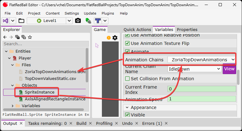 We can see the animation file used by the player by expanding the Player's Objects folder, selecting the SpriteInstance, and looking at its Animation Chains variable. Notice that this variable is set to the .achx file in its Files folder.