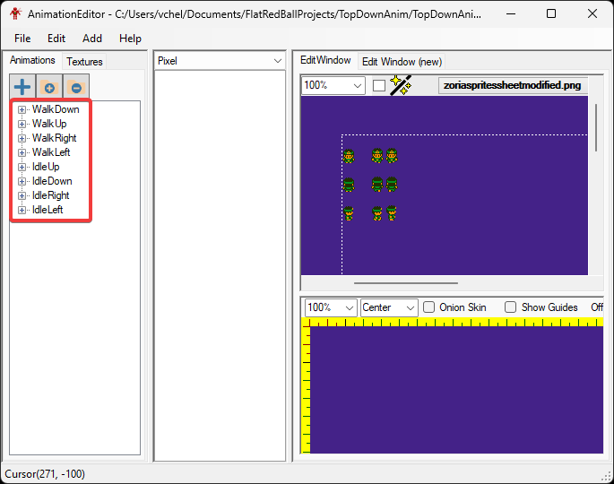 This means that if you wanted to add additional animations to the .achx, or if you wanted to create a brand new .achx, every animation should have 4 versions, one for each direction. For example, you might add: