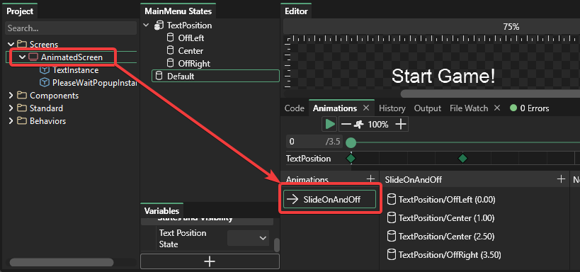 For this example, the project has a screen called AnimatedScreen which contains an animation named SlideOnAndOff.