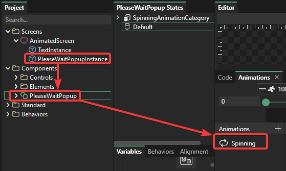 AnimatedScreen also contains an instance of a component named PleaseWaitPopup which has its own animation called Spinning. Note that the Spinning animation is marked as repeating, so once it starts it will play until it is stopped in code.