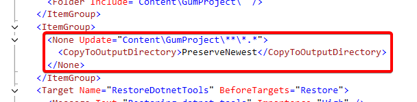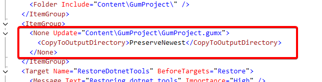 <figure><img src="https://2695663588-files.gitbook.io/~/files/v0/b/gitbook-x-prod.appspot.com/o/spaces%2F-M_fzQmxQ1VeUFHcoo2c%2Fuploads%2Fgit-blob-cb7c23f913393c08cc7ac4348d88e5f1ed9a3e93%2Fimage.png?alt=media" alt=""><figcaption><p>Entry for GumProject.gumx in the csproj file.</p></figcaption></figure>