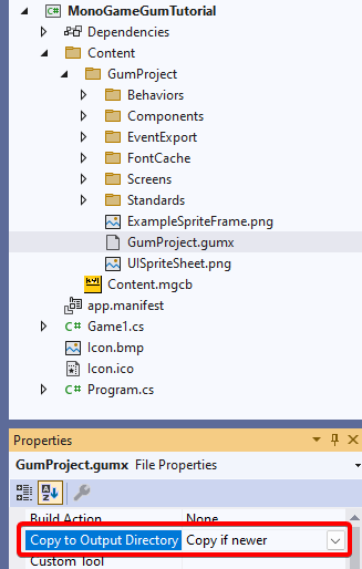 First, we'll set up our project so all Gum files are copied when the project is built. To do this:
