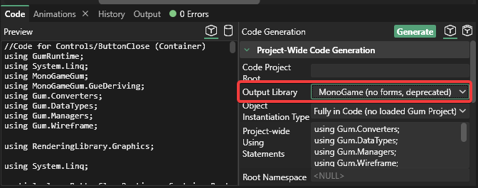 The Gum tool supports code generation which allows us to interact with Gum components without needing to cast or use string names. We can enable code gen in Gum by checking the check boxes in the Code tab. Also, be sure to switch the Output Library to MonoGame.