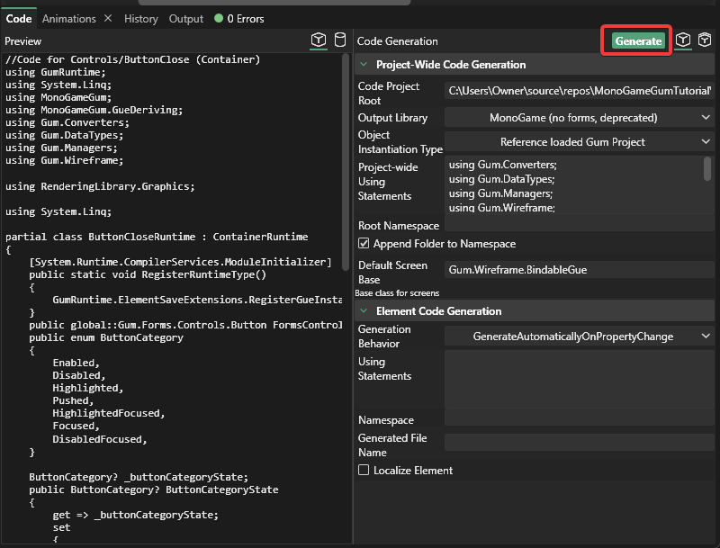 Generated code is re-generated whenever a change is made in Gum or whenever you press the **Generate Code** button.