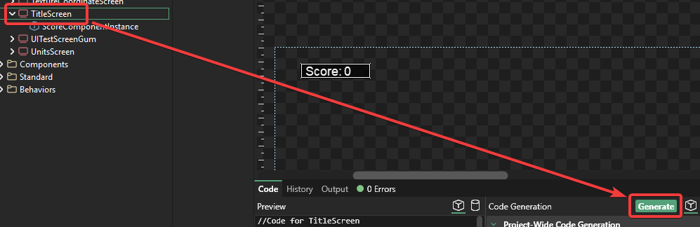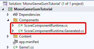 This produces a fully-generated class named ScoreComponentRuntime. In this case, the code is using **FullyInCode** instantiation type, which means the generated code shows the code necessary to create this component without loading the gum project. If you would like to use generated code without loading a Gum file, then this approach might be useful. Usually this approach is useful if you would like to avoid file IO or if you cannot read from disk (such as on an embedded device).