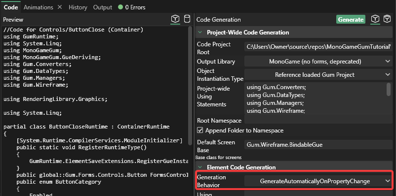 We can enable automatic saving of generated code in Gum by specifying the location of our .csproj file. To do this, set Code Project Root to the full path of folder containing your .csproj: