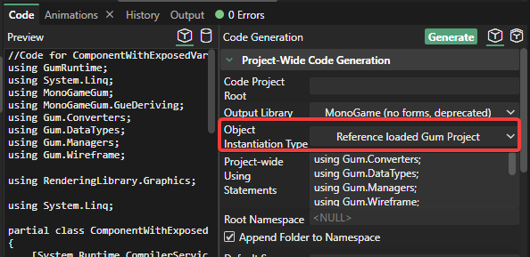 Notice that initially Gum may be generating additonal statements which are not needed; however, as your project grows in complexity these using statements may be needed - especially if you are using an **Object Instantiation Type** of **FullyInCode**.