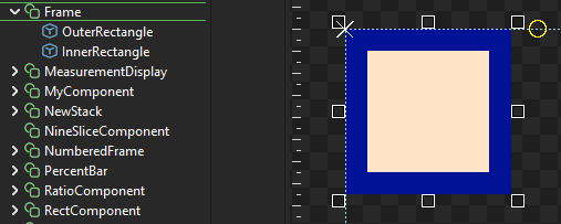 Using the example above, the RectangleInstance is dropped on the ContainerTestInstance. Since the ContainerTestInstance is of type Frame, then the Default Slot is applied on the drop, which results in the RectangleInstance's Parent being set to `ContainerTestInstance.InnerRectangle`.