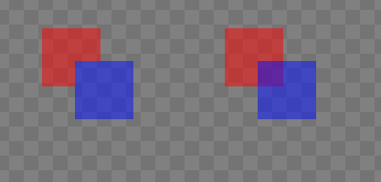 Note that by setting Is Render Target to true, the entire container's Alpha can be adjusted rather rather than the alpha value cascading to each individual child. This Alpha value is used to control transparency *after* all children have been drawn. We can see the difference between a partially-transparent Container and each child individually being made partially transparent by overlapping two children ColoredRectangles.
