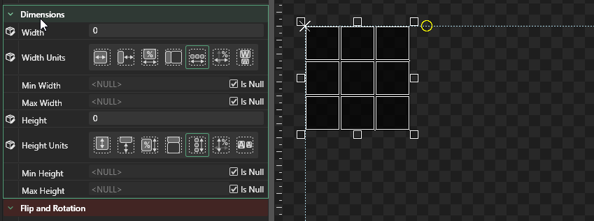 For example, the following 3x3 grid contains children with an absolute width of 50. The grid's `Width Units` is set to `Relative To Children`. Notice that as the grid's `Width` increases, it grows horizontally. This horizontal growth results in a larger cell size, so each child is spaced apart.