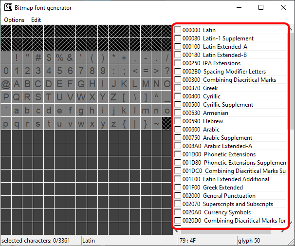 5. Select which characters you would like included in your font. Adding characters can increase the font size, but may be required depending on which characters you intend to use.